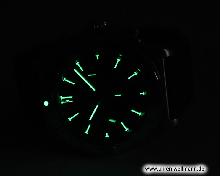 Das entspiegelte Saphirglas schützt das Zifferblatt zuverlässig vor äußeren Einflüssen und sorgt für optimale Ablesbarkeit. Das grüne Zifferblatt ist mit applizierten Indizes und Leuchtmasse versehen, wodurch auch bei schlechten Lichtverhältnissen eine gute Lesbarkeit gewährleistet ist.