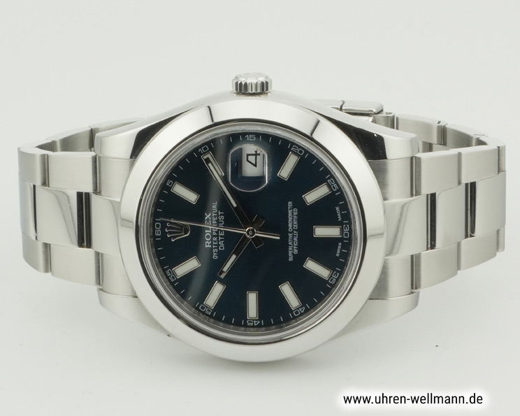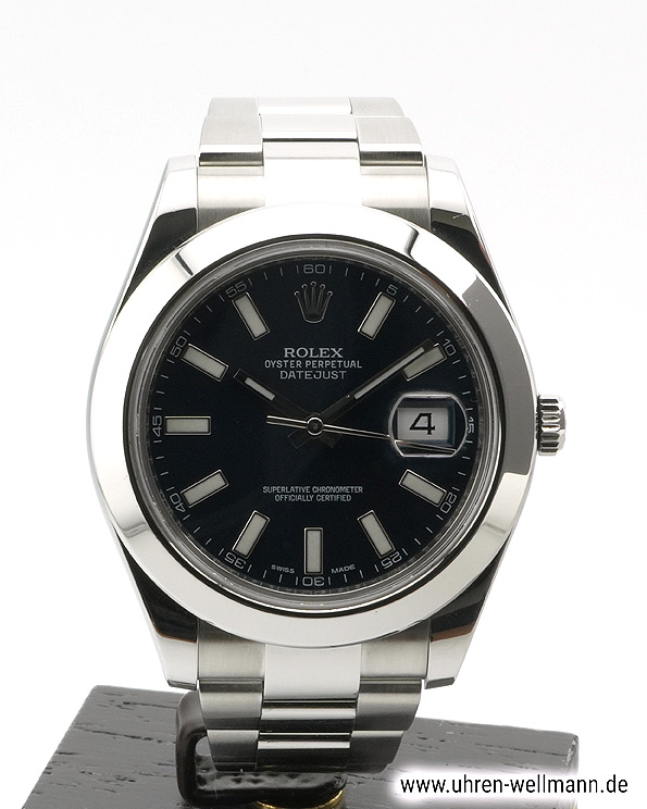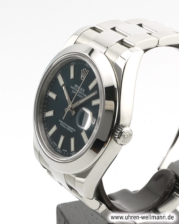 Die Rolex Datejust II 116300 ist als robuste Automatikarmbanduhr konzipiert und erfüllt die hohen technischen Standards der Marke. Das Edelstahlgehäuse besteht aus dem von Rolex entwickelten Oystersteel, einer besonders korrosionsbeständigen Stahllegierung, die auch unter anspruchsvollen Bedingungen Formstabilität und Oberflächenqualität bewahrt. Mit einem Durchmesser von 41 mm und einer Höhe von rund 12 mm bietet das Gehäuse eine präsente, aber ausgewogene Erscheinung.