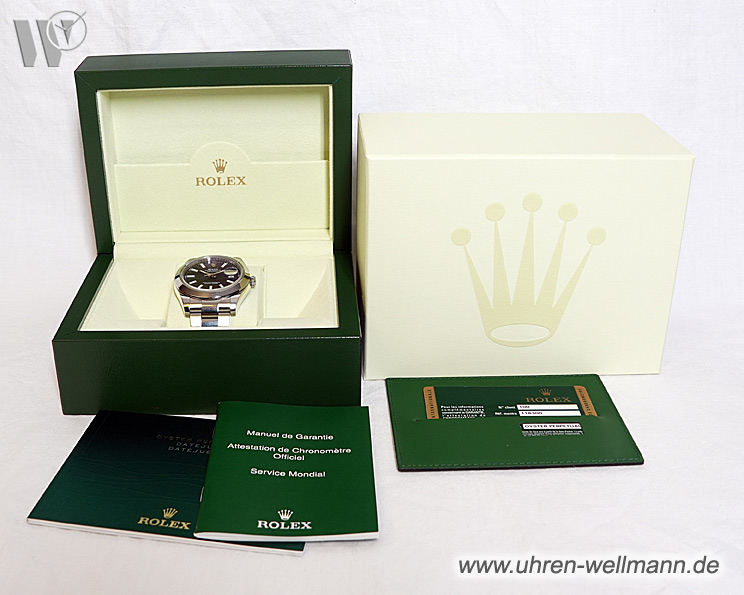 Im Inneren arbeitet das Rolex Manufakturkaliber 3135, ein seit Jahrzehnten bewährtes Automatikwerk, das für seine Gangstabilität und Wartungsfreundlichkeit bekannt ist. Es verfügt über eine Datumsfunktion mit sofortigem Datumswechsel und wird über einen beidseitig aufziehenden Rotor mit Energie versorgt. Die Gangreserve liegt bei etwa 48 Stunden. Das Werk ist als Chronometer zertifiziert und erfüllt die strengen Präzisionsanforderungen von Rolex.